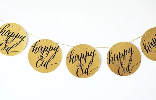2. Happy Eid Banner: Add a classy touch to your party with a mod Happy Eid golden banner in stylish calligraphy. Hang it near the front entrance or above your dining table for everyone to see. (via Modern Eid)