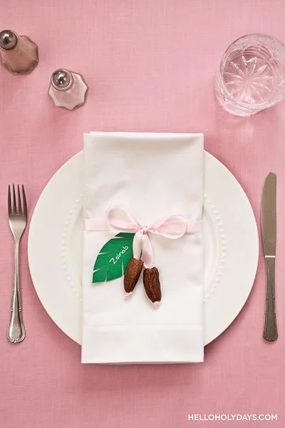 10. Date Place Setting: Personalize your Eid table place setting with this cute and super easy idea using pitless dates, ribbon and construction paper. Switch the ribbon color to match your party’s theme. (via Hello Holy Days)