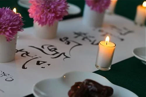 17. Calligraphy Paper Runner: For a quick and easy way to dress up your food table, consider creating your own paper runner. Just grab a large sheet of paper from your local art store, cut it to your table size and decorate with calligraphy or any other Eid-themed design. Pair with flower vases and tea candles for an elegant look. (via Ramadan Joy)